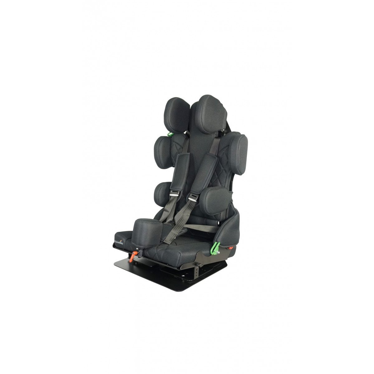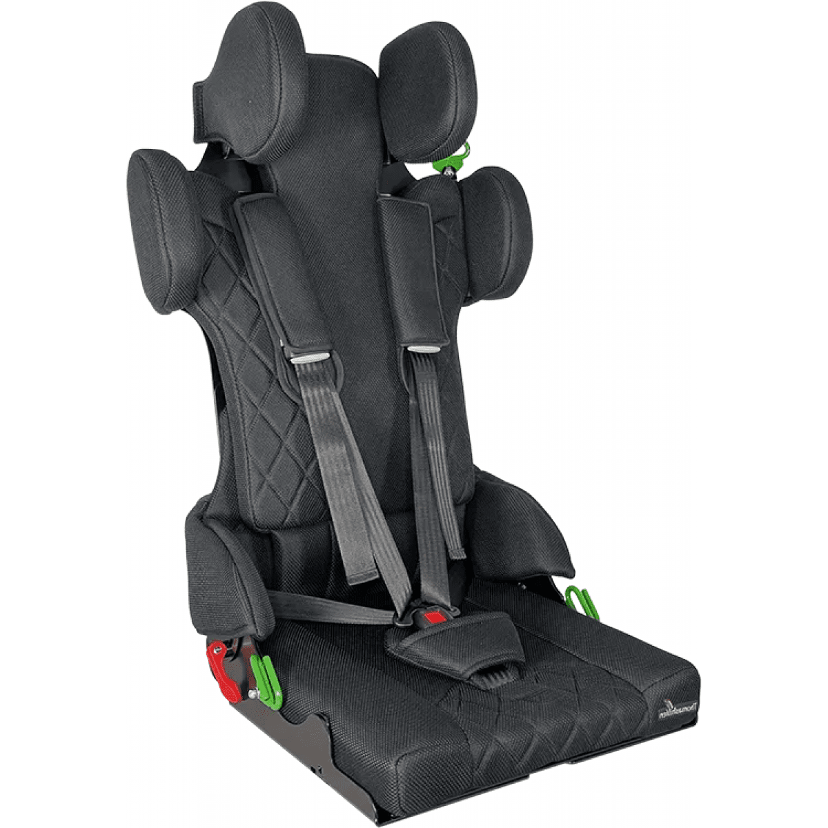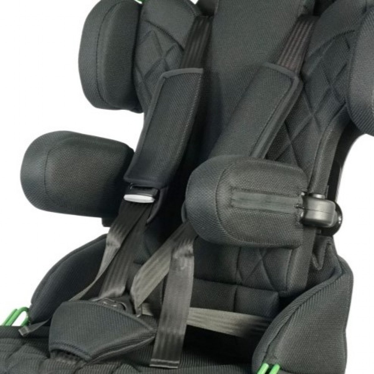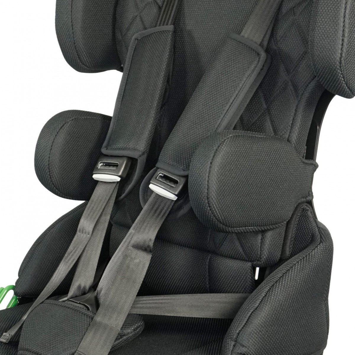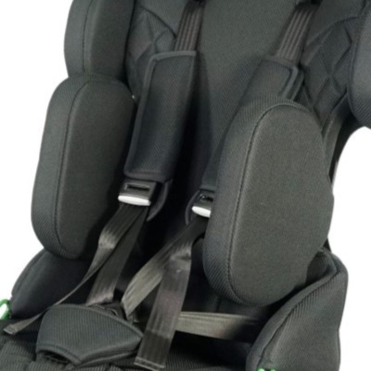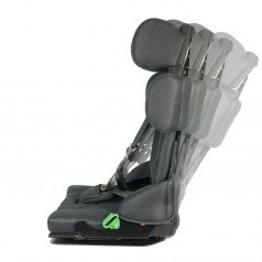 Для правильной поддержки предусмотрены плавная регулировка высоты спинки, анатомичный подголовник и опоры для бёдер. Важной особенностью модели являются плечевые поддержки, которые стабилизируют положение ребёнка и предотвращают излишние наклоны во время движения. Дополнительно могут устанавливаться боковые поддержки с откидным механизмом, усиливающие фиксацию туловища.