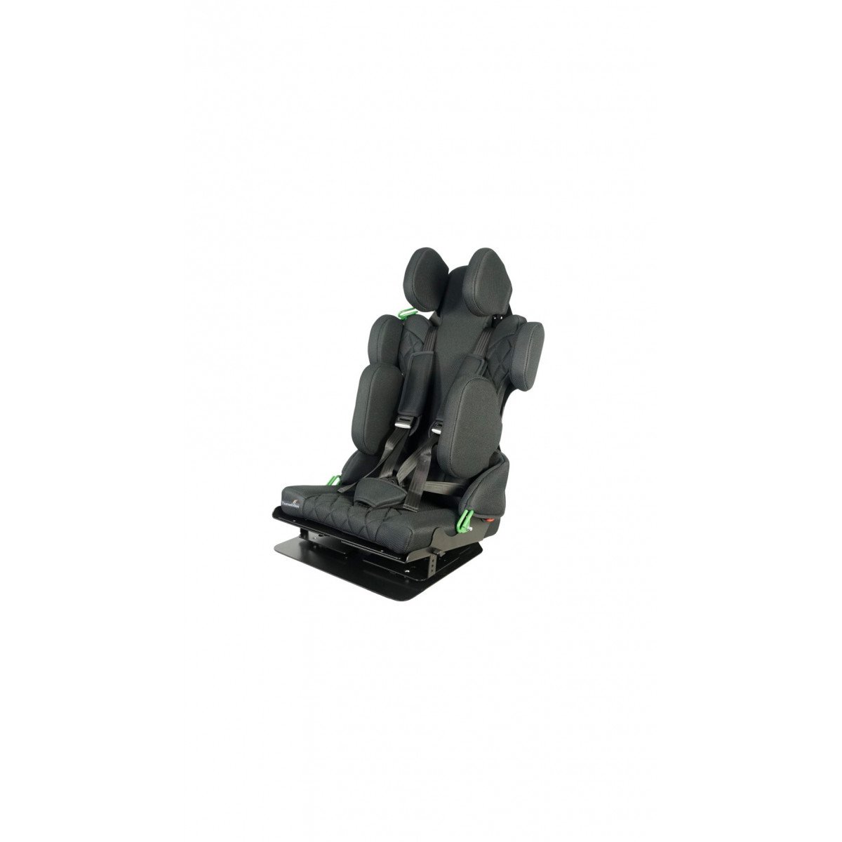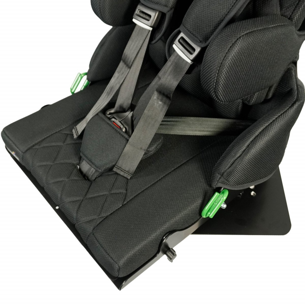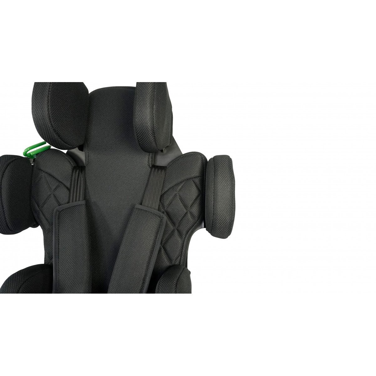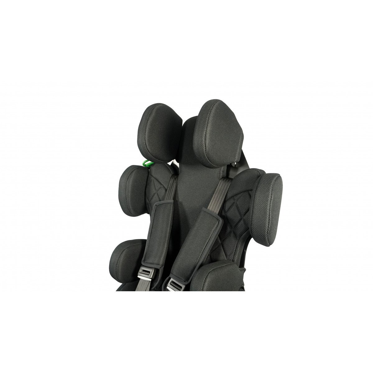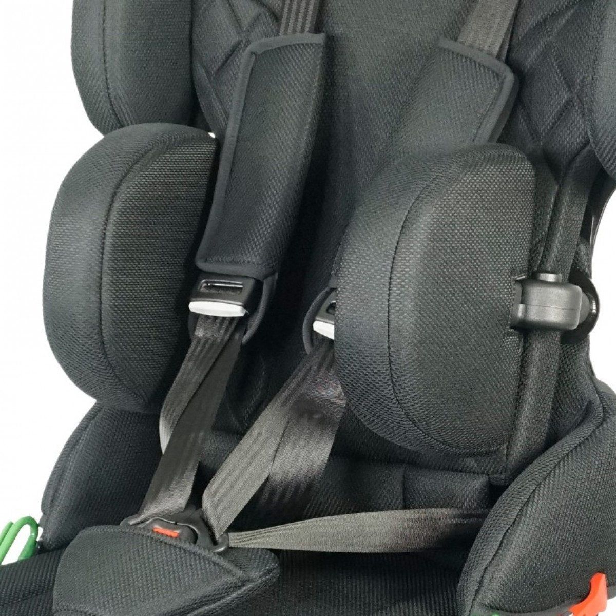 Для правильной поддержки предусмотрены плавная регулировка высоты спинки, анатомичный подголовник и опоры для бёдер. Важной особенностью модели являются плечевые поддержки, которые стабилизируют положение ребёнка и предотвращают излишние наклоны во время движения. Дополнительно могут устанавливаться боковые поддержки с откидным механизмом, усиливающие фиксацию туловища.