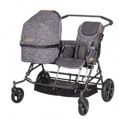 Коляска построена на полностью складывающемся шасси Tom 4 с пружинной подвеской, задними пневматическими колёсами и поворотными передними колёсами — она устойчива, плавно едет и легко управляется. Сиденье и люлька съёмные, могут устанавливаться по ходу или против хода движения, а при необходимости использоваться отдельно на собственных шасси, что делает систему максимально гибкой.