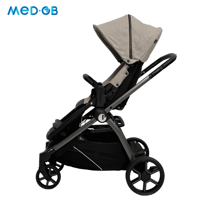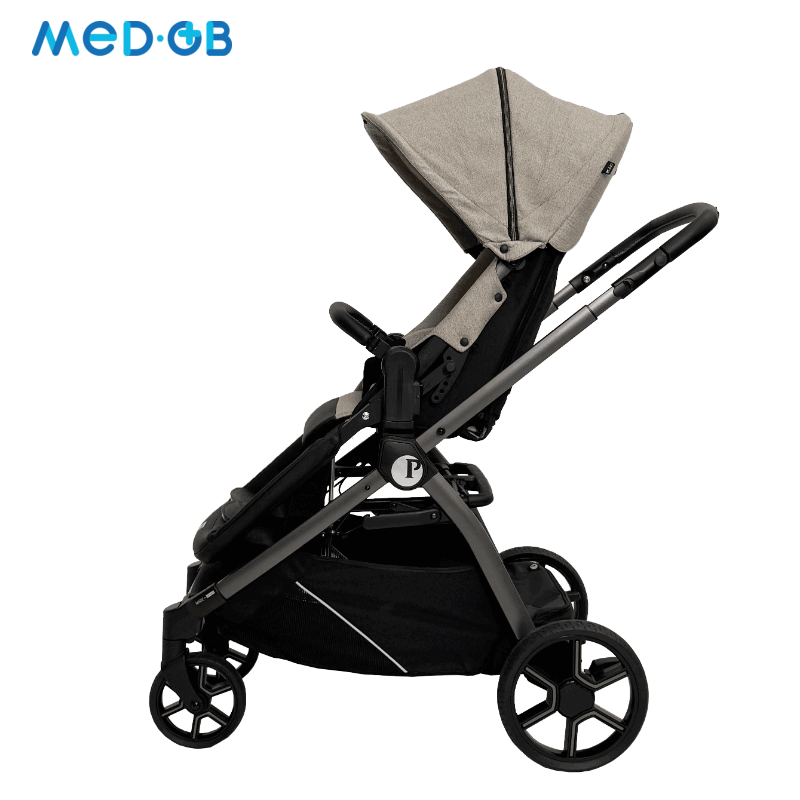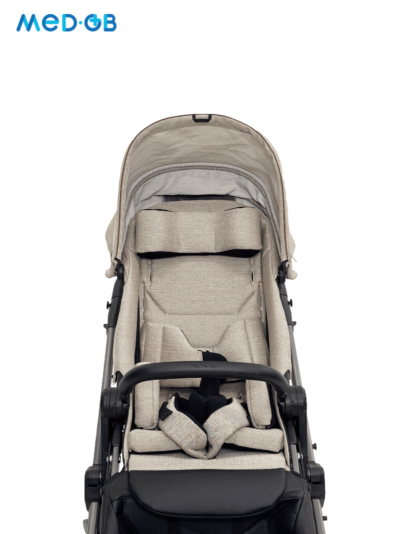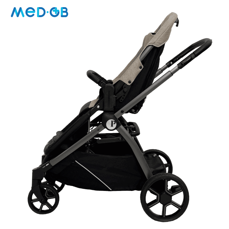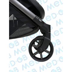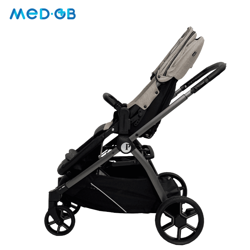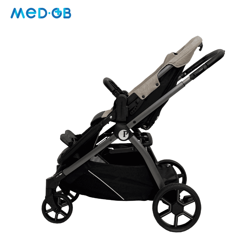 Коляска имеет легкую, но в то же время прочную алюминиевую раму, обеспечивая маневренность и простоту в управлении. Модель разработана с акцентом на меры предосторожности, необходимые для контроля осанки и поддержки в течение прогулок. Это особенно важно для детей, которые не могут самостоятельно удерживать правильное положение.