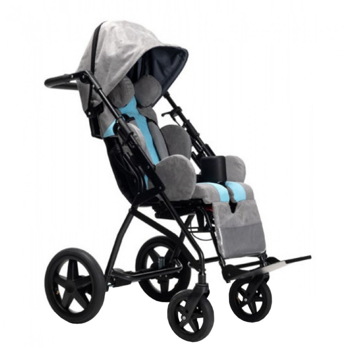 Спинка кресла может наклоняться до 160 градусов, что позволяет ребёнку принимать удобное положение для отдыха как дома, так и на улице. Подножка единая и регулируется по углу наклона, превращая кресло в удобную кушетку. Мягкий съёмный абдуктор помогает контролировать положение ног, предотвращая их перекрестие, а боковые поддержки обеспечивают фиксацию тела в правильном положении, что способствует повышению безопасности и комфорта. За счёт появления амортизаторов коляска может двигаться ещё мягче. Задние колеса пневматические, они дополнительно снижают дискомфорт при движении, поглощая неровности дороги.