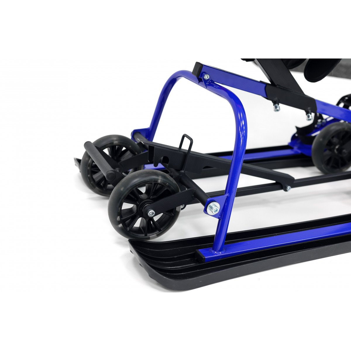 - Снегокат оснащён широкими откидными колёсами, которые позволяют перемещать его как по асфальту, так и по снегу