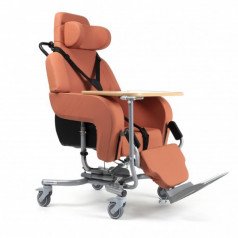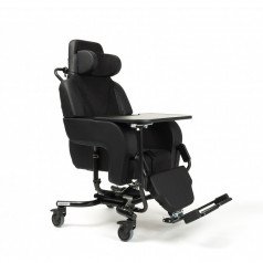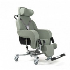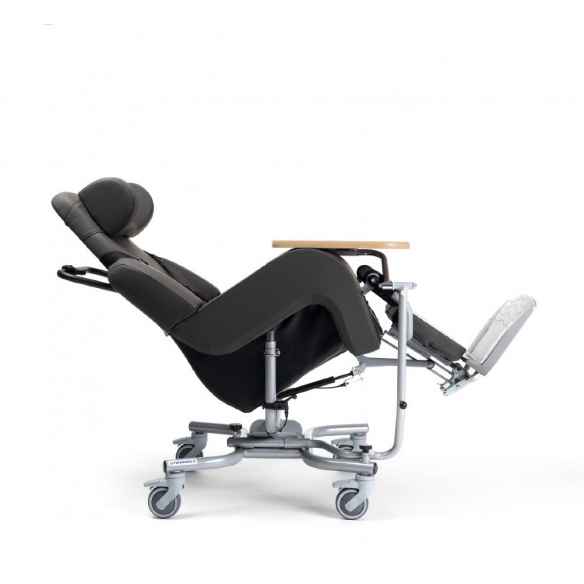 Кресло позволяет плавно регулировать угол наклона от –4° до +36° с помощью гидравлических цилиндров, обеспечивая удобное положение для отдыха и ухода. При наклоне автоматически удлиняется подножка, адаптируясь к положению пользователя. Сиденье выполнено из прочной, дышащей обивки, а высота посадочного места регулируется за счёт сменных подушек различной толщины — 6, 8 или 10 см.