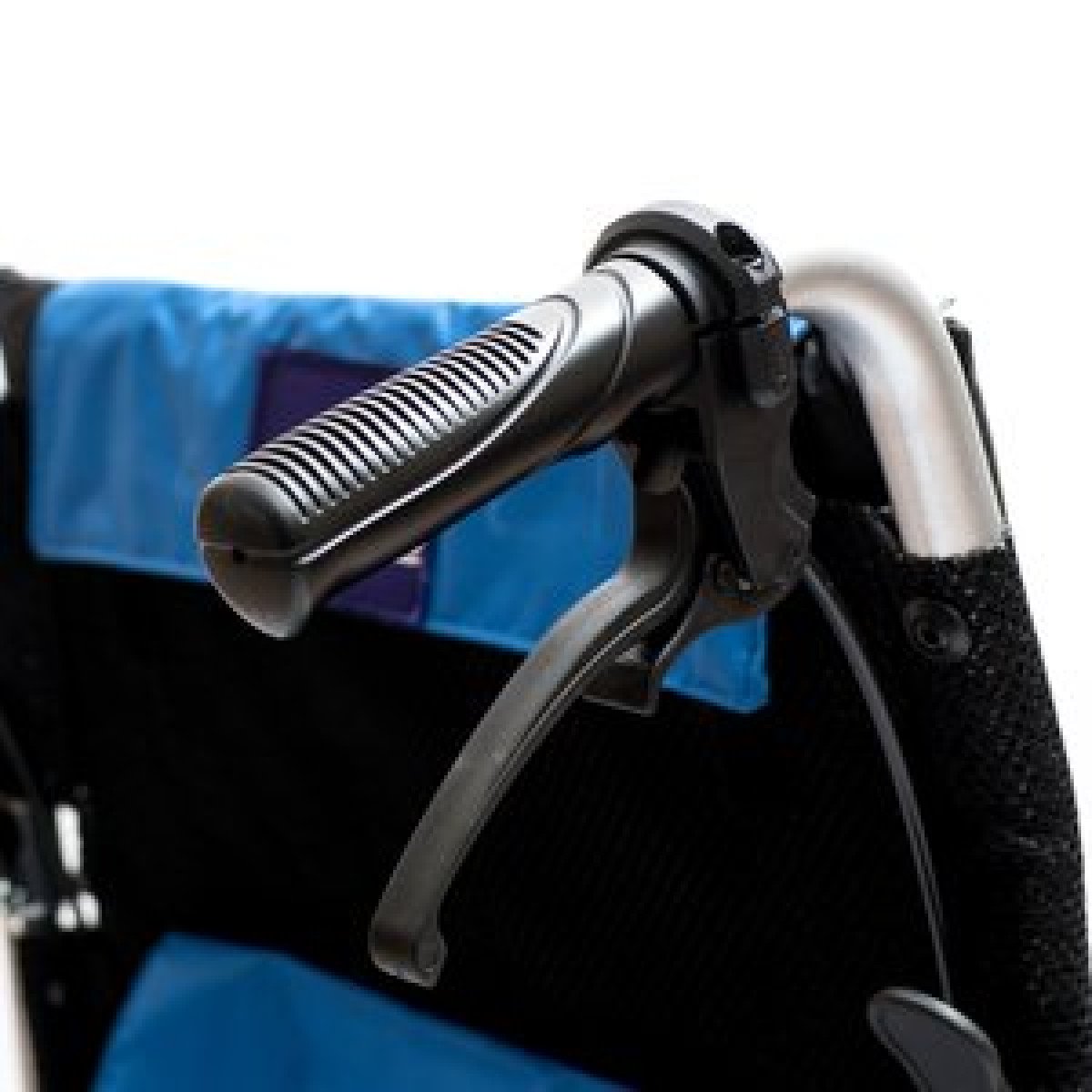 Для удобства пользователя кресло оснащено откидными и съёмными подножками с регулировкой по длине голени, а также подлокотниками с регулировкой по высоте. Складная спинка обеспечивает компактность при транспортировке, а ручки для сопровождающего регулируются по высоте для максимально комфортного управления. На ручках установлены тормоза, что позволяет безопасно фиксировать коляску при остановке.