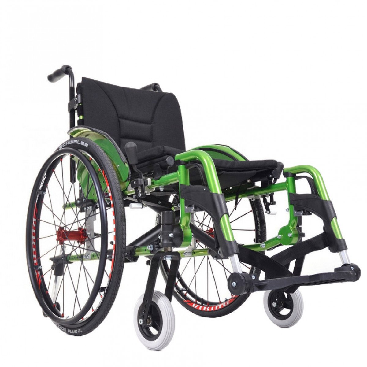 Вместо подлокотников на активную инвалидную коляску устанавливаются защитные щитки. Особенностью модели является возможность регулировки натяжения спинки и сидения с помощью специальных ремней. Дополнительно спинку можно настроить по вертикали, а сидение по глубине и высоте. Подножки можно снять, отрегулировать по высоте или отвести в сторону.