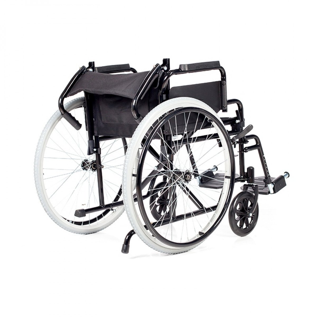 Коляска складывается без инструментов — достаточно откинуть подножки и потянуть за середину сиденья. Складная спинка дополнительно уменьшает габариты при транспортировке. Откидные подлокотники с мягкой опорой и жёсткой боковой защитой делают посадку удобнее и обеспечивают дополнительную устойчивость.