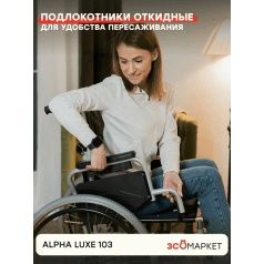 Коляска легко адаптируется под пользователя: подлокотники регулируются по высоте с помощью проставок, при необходимости откидываются или снимаются для удобного пересаживания. Подножки также снимаются или откидываются, а раздельные опоры для стоп помогают правильно разместить ноги. Сиденье можно настроить по высоте, что упрощает подбор посадки под рост и задачи пользователя. Складная конструкция позволяет быстро сложить Alpha Luxe 103 без инструментов и сэкономить место при хранении или перевозке.