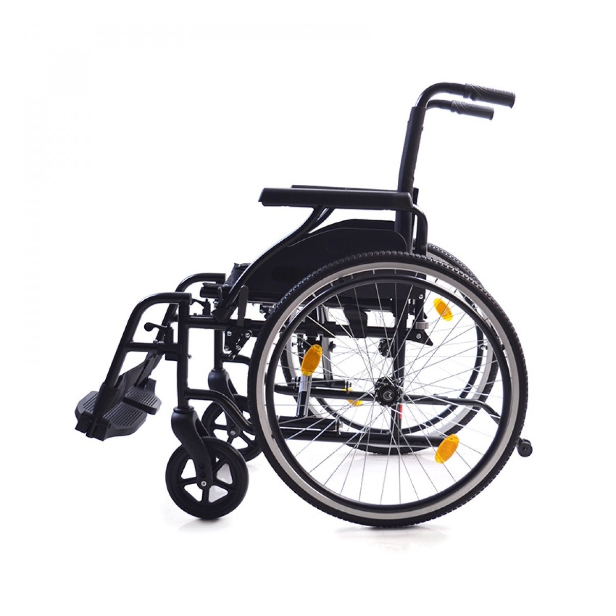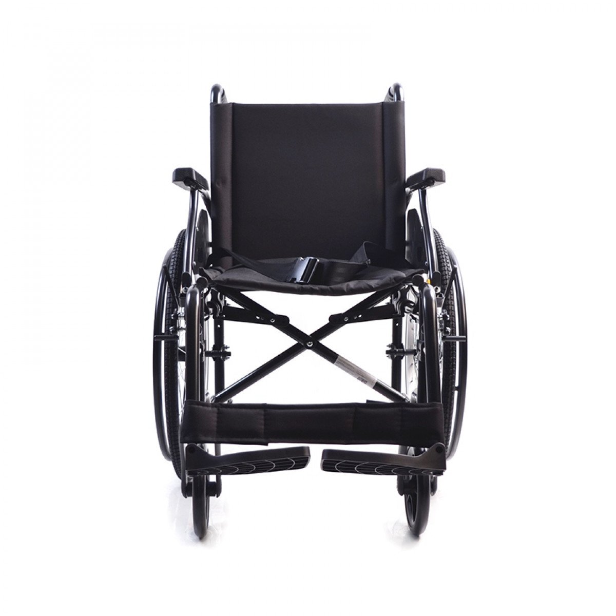 Коляска оснащена сиденьем с поясным ремнём для дополнительной фиксации и устойчивого положения. Подлокотники — съёмно-откидные, с защитными щитками, что упрощает пересаживание. Подножки регулируются по высоте, снимаются и откидываются, а ремень-упор для голени помогает правильно разместить ноги и снизить нагрузку.