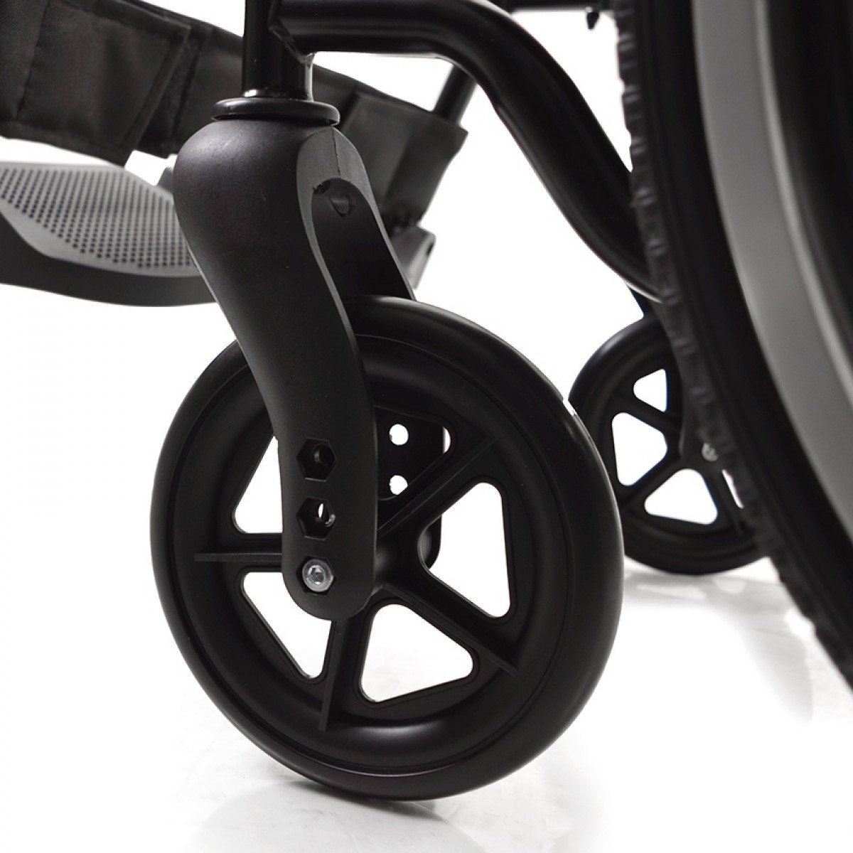 Передние колёса — цельнолитые, с регулировкой высоты вилки, что позволяет адаптировать посадку под пользователя. Задние колёса — быстросъёмные, доступны в вариантах с цельнолитыми или пневматическими шинами. Для устойчивости предусмотрен антиопрокидыватель на роликовой опоре, который делает передвижение безопаснее.