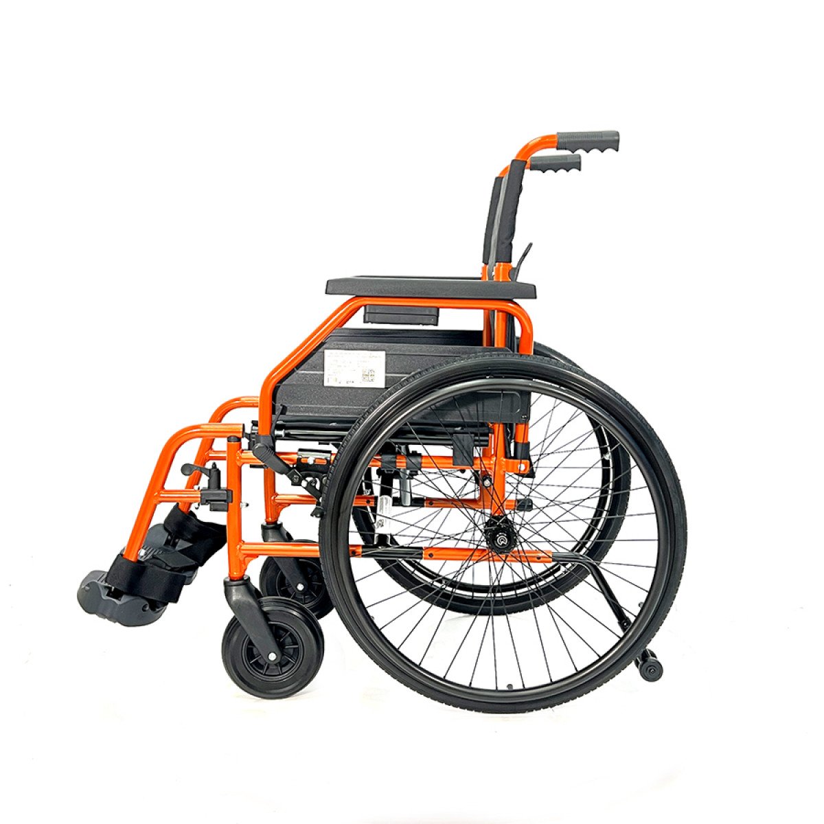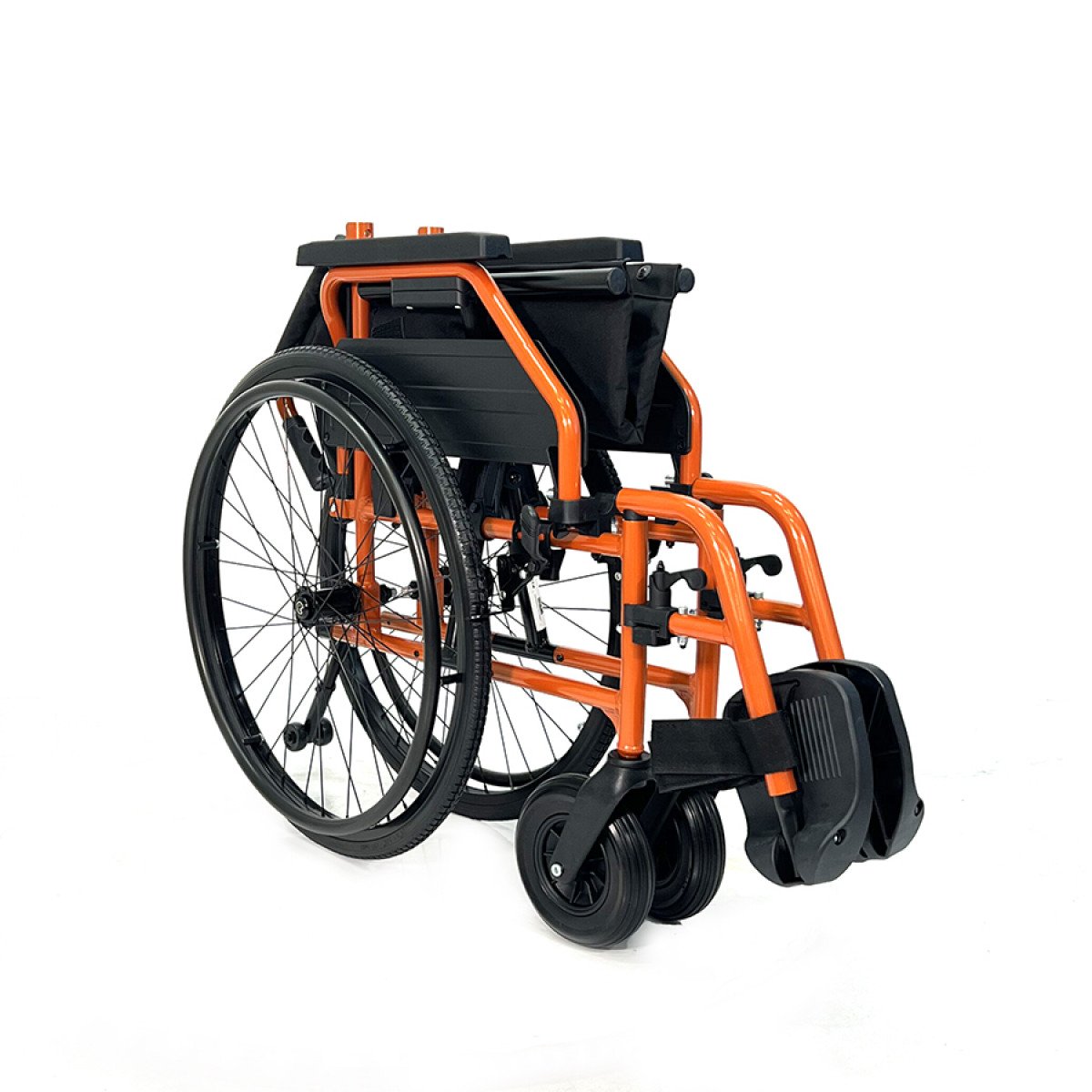 Задние колёса — быстросъёмные, с кнопочной фиксацией, доступны в вариантах с цельнолитыми или пневматическими шинами. Передние колёса обеспечивают манёвренность, а вся система колёс помогает уверенно передвигаться по разным покрытиям. Стояночные тормоза регулируются по глубине установки, что повышает контроль и безопасность при остановке.