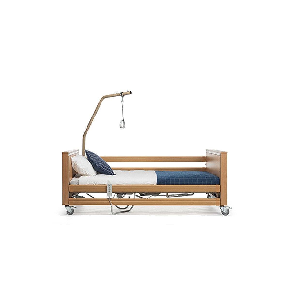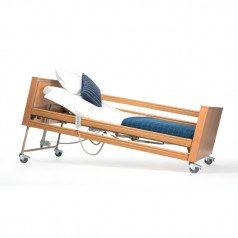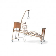 Конструкция включает деревянные изголовье, изножье и боковые ограждения, которые обеспечивают безопасность пользователя. Прочная металлическая рама с порошковым покрытием установлена на поворотные колёса с тормозами, что облегчает перемещение. Кровать адаптирована под бытовое и профессиональное использование и может подключаться к системе вызова медперсонала.