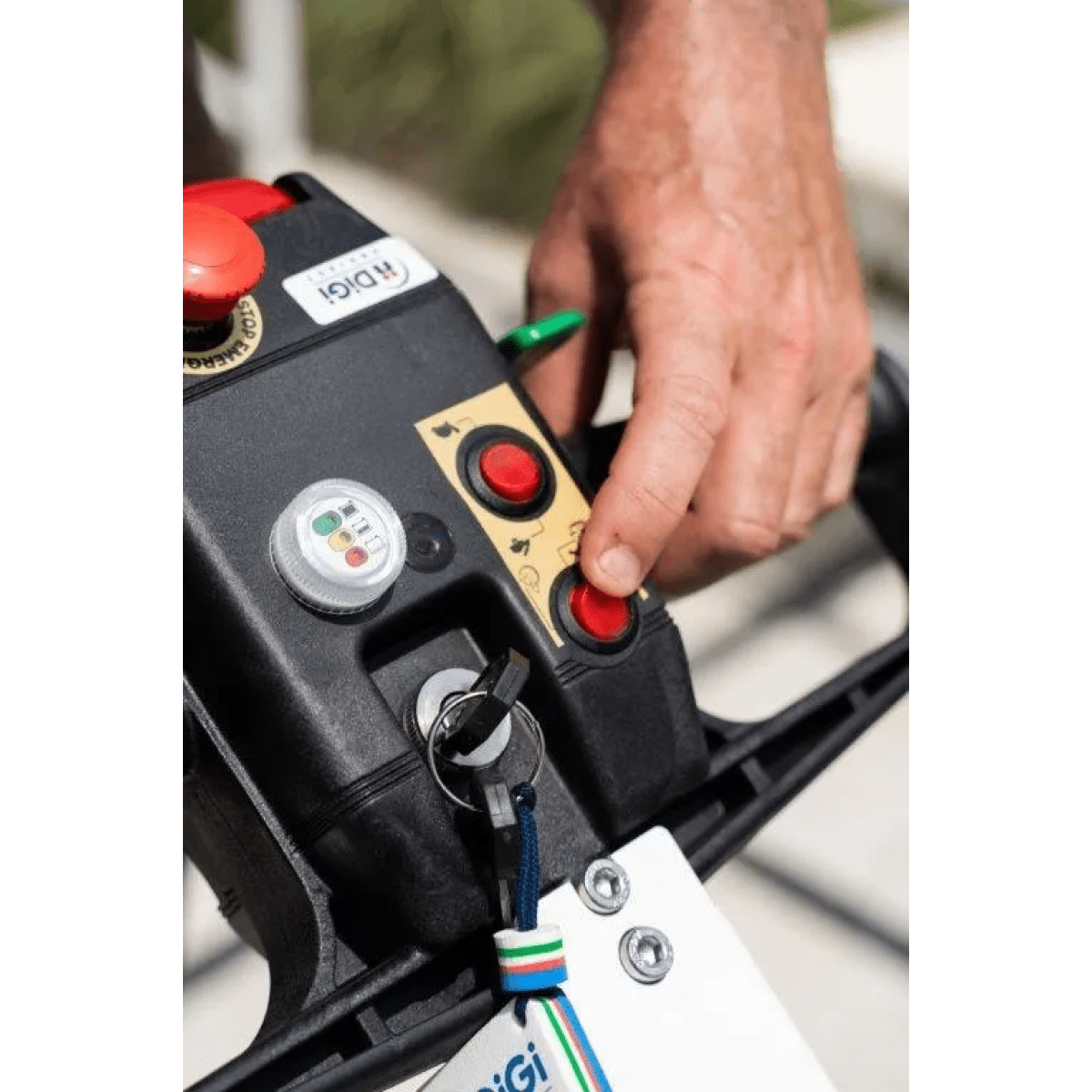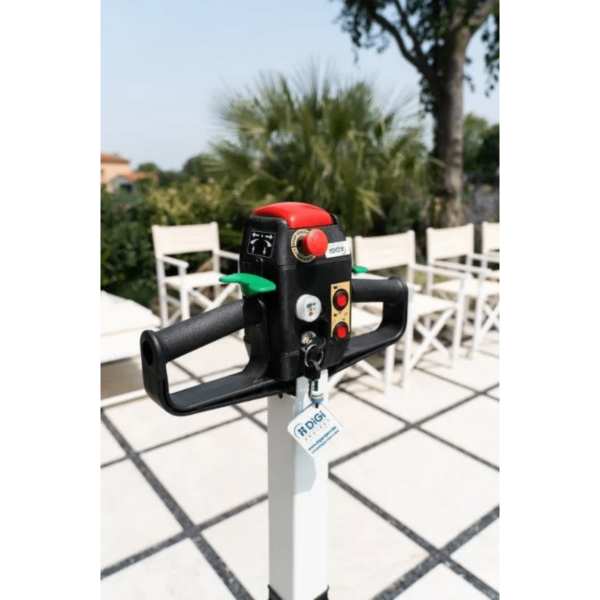 - Автоматический рычаг управления питанием с кнопками вверх и вниз, индикатор уровня заряда батареи и аварийный гриб