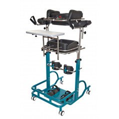 Рама на колёсах оснащённая тормозом, держатели стоп, коленные упоры, бедренные поддержки, грудные поддержки, подлокотники, столик, абдуктор, электро-механический мотор, широкие или узкое сиденье (на выбор)